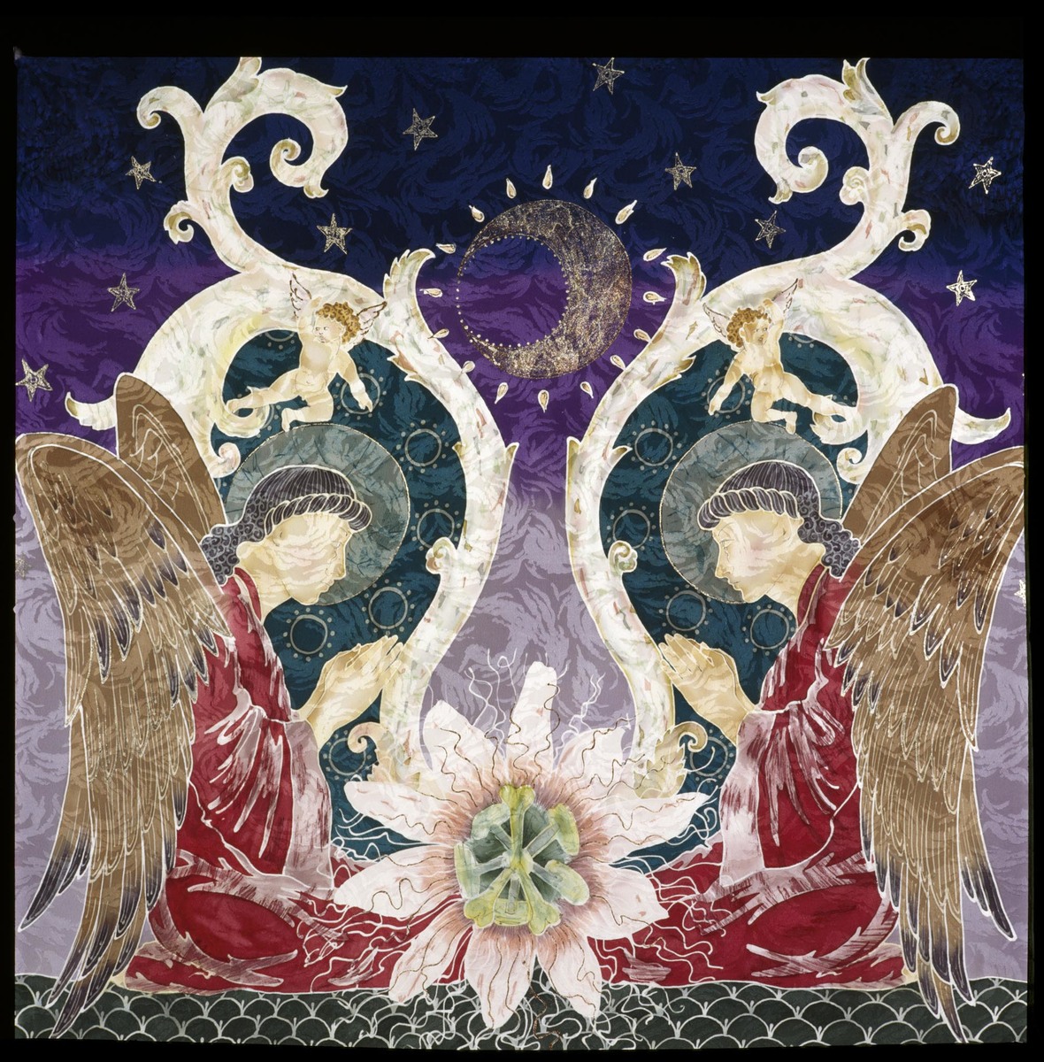 Angels Among Us:Dyes, resists, metallic leafs on crepe 25 x 29 SOLD